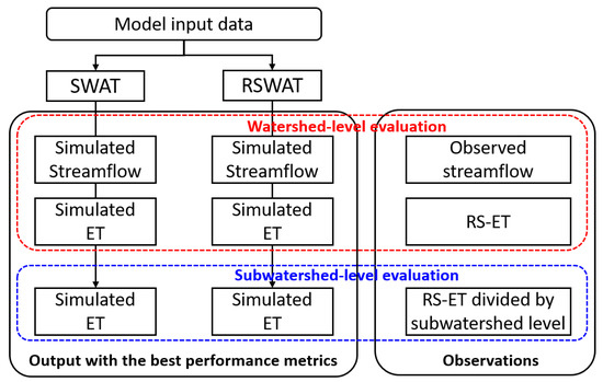 First, SWAT and RSWAT were calibrated against streamflow and watershed level RS-ET; their outputs were subsequently compared at the watershed level. Then, the ET outputs from SWAT and RSWAT were compared at a finer spatial level using a subwatershed level RS-ET. These comparisons were used to test the ability of RS-ET to further constrain outputs from different versions of SWAT, and improve the ability to discern performance differences resulting from different model structures.