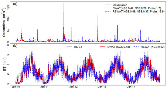 Comparisons of daily observations (solid gray line), and simulations from SWAT (solid red line) and RSWAT (dotted blue line): (a) streamflow and (b) ET.