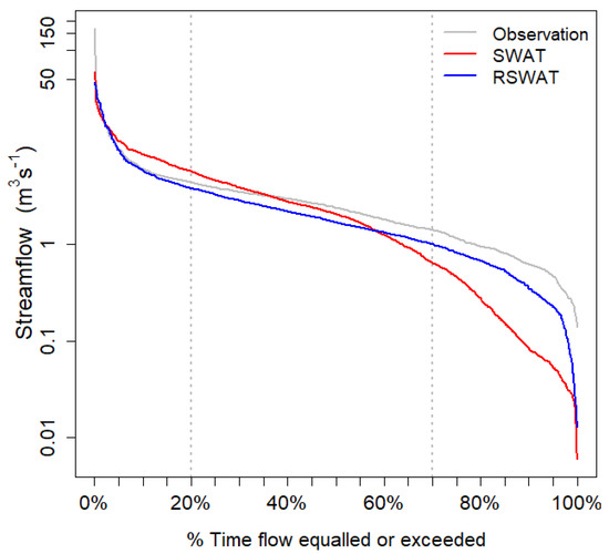 Flow duration curves for daily observations (solid gray line), and simulations from SWAT (solid red line) and RSWAT (dotted blue line).