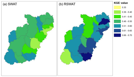 Spatial distribution of subwatershed-level Kling–Gupta Efficiency (KGE) values for ET simulations: (a) SWAT and (b) RSWAT.