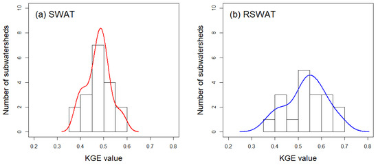 Density plots for subwatershed-level KGE values with an interval of 0.05: (a) SWAT and (b) RSWAT.