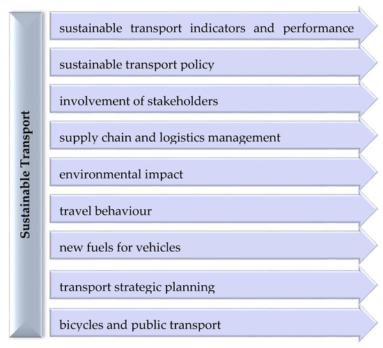 In recent years, the issue of sustainable transport has been more frequently addressed in scientific research. A detailed review of the studies on sustainable transport between 2000–2019 conducted by Zhao et al. [11] made it possible to identify nine hot research topics in this area: sustainable transport indicators and performance model [12,13], sustainable transport policy [14], involvement of stakeholders [15], supply chain and logistics management, environmental impact, travel behaviour, new fuels for vehicles, transport strategic planning [16,17], and bicycles and public transport (Figure 1). The studies have also indicated the main research gaps on sustainable transport relating to its social sustainability, use of information and communication technology (ICT), sustainability benefits, and its resiliency [11].