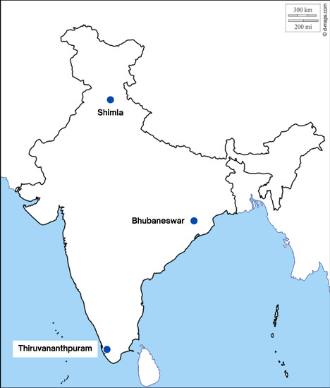 Furthermore, this urbanisation paradigm is marked by a relative decline of small cities in the urban system. There has been a “consistent strengthening” of large cities in India’s urban system at the expense of decline in the share of urban population living in small and medium cities. This has led to unequal distribution of urban population among different city size categories. Almost 43% of the total urban population lives in the larger million-plus cities [35]. Nevertheless, almost 60% of India’s urban population still lives in cities with fewer than one million people—approximately the size used for the working definition of small and intermediate cities we are considering in this paper. We have chosen three representative small cities in different parts of India for our analysis here, namely Thiruvananthpuram (formerly Trivandrum), the state capital of Kerala, Bhubaneswar in Odisha state, and Shimla, the state capital of Himachal Pradesh (see Figure 1 and Table 1).
