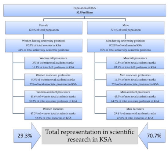 Remarkably, despite the female faculty forming 41% of the total in Saudi universities, women researchers represent only 23.2% of the total researchers in KSA, which is still less than the global average (29.3%, see Figure 1) [9,11]. Therefore, the empowerment of women in scientific research and the enhancement of the ingredients for innovation in KSA in line with the Saudi Vision 2030 and UNESCO goals in this regard remains modest, which leads to modest pivoting of women and their pioneering role in scientific research and developmental paths, as well as reflection on the evaluation and advancement of society’s plans.