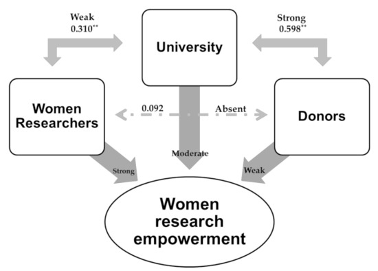On the other hand, Pearson’s correlation and linear regression analysis also revealed that the role of researchers has a significant positive influence on the role of the university, with (β = 0.310, r2 = 0.096, p < 0.001), implying that only 9.6% of the variables in the role of the university can be explained by the model containing the role of researchers. Thus, despite the positive impact of the role of researchers on the role of universities in empowering women researchers, this correlation required to be strengthened. In contrast, no significant direct correlation was obtained between the role of the researchers and the role of donors. Thus, more attention should be paid to establishing a direct correlation between both roles.