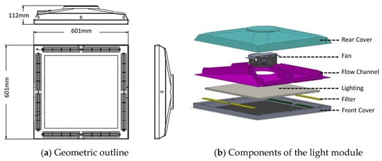 The geometry of the embedded hospital germicidal lamp module is illustrated in Figure 1a. The lamp has a square geometry of 601 mm by 601 mm by 112 mm (thickness). Its interior components are shown in Figure 1b which include the front cover, air filters, flat light panel, flow channel, fan, and rear cover. The air filters are installed inside the front cover at the inlets of the air flow.