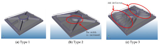 Three types of flow channels, as shown in Figure 2 and represented by Types 1, 2, and 3, were simulated numerically. Type 1 was a standard design; Type 2 was modified from Type 1 by enlarging the channel size with round edges; Type 3 was a modification of Type 2 by further enlarging the channel size and also adding flow deflectors to reduce flow resistance.