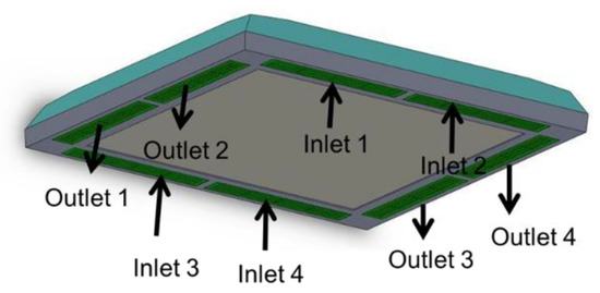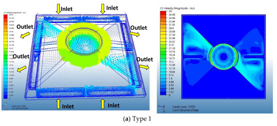 In the simulation, the environment was set to the temperature of 25 °C and relative humanity of 50%. The operation conditions of the fan were 110 V, 0.58 A, and 1000 rpm for the voltage, current, and rotation speed, respectively. The fan and air filter conditions were taken from the manufacturers’ specifications. Steady-state simulations were performed for the three types of channel configurations illustrated in Figure 2. The finite element numerical simulation steps were as follows: