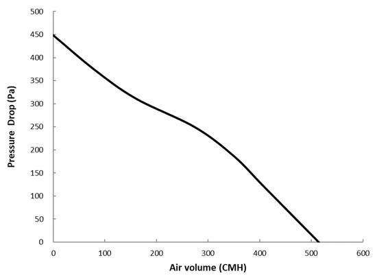 The fan performance curve [16] from the manufacturer, shown in Figure 4, was inputted to the CFD software for simulation.