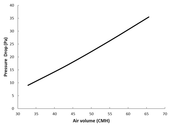 The filter resistance curve of the single layer glass fiber air filter of AR103 from the manufacturer [17], as shown in Figure 5, was also inputted into the CFD software to provide the flow resistance of the filter.