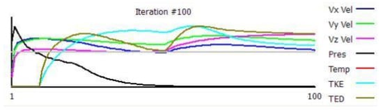 The gauge pressures of the boundary conditions of the air inlets and outlets displayed in Figure 3 were set to zero.