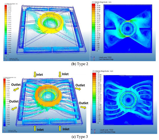 The velocity distributions of the three types of flow channels are portrayed in Figure 8 for the bird-eye view (left) and the mid-plane (right) perpendicular to the Z-axis (i.e., the vertical direction at the height of 56 mm from the bottom) under a rotation speed of 1000 rpm. The air is drawn in from the inlets to the lamp center and then exits to the environment from the outlets through the air channels. Because of the swirl and non-uniform behaviors of the fan flow and the difference in flow resistance, the flow fields of the three types show different features. For Type 1, flow swirl at the lamp center is obvious and the velocity distribution is extremely skewed toward one direction (the diagonal from the upper-left corner to the lower-right corner), as shown in Figure 8a; i.e., the velocity distribution is very non-uniform. By enlarging the flow channel and using round edges for the Type 2 design, both the large swirl and skewness exhibited in the Type 1 design were reduced, but the non-uniformity of the flow field in the channels was still obvious, as shown in Figure 8b. Further modification of the flow channel by adding flow guides resulted in a more uniform velocity distribution, as evident from Figure 8c for the Type 3 design for which both the flow swirl and skewness were greatly reduced; the effectiveness of flow guides adopted in the Type 3 design is clear.