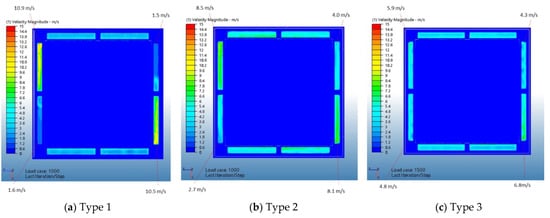 The inlet/outlet velocity distributions for the three designs are shown in Figure 9. The inlet flows of the original design (Type 1), shown in Figure 9a, are uniform. However, the outlet flows are not uniform; one has larger velocities and the other has reverse flows. The difference between the maximum and minimum velocities is about 9.4 m/s. For Type 2, the outlet flow is better but still not very uniform, as shown in Figure 9b. The difference between the maximum and minimum velocities is about 5.8 m/s. For Type 3, both inlet and outlet flows are more uniform, as illustrated in Figure 9c, with the difference between the maximum and minimum velocities being about 2.5 m/s. For comparison, the overall inlet and outlet volumetric flow rates (ventilation rates) are summarized in Table 3. Three trends can be observed. Firstly, the inlet flow rates are uniform, irrespective of the design types, while Type 3 has a larger inlet flow rate compared to those of the other two. Secondly, similar to the uniformity of the outlet velocity distribution, the uniformity of the outlet flow rates is better for Type 3. The differences between the maximum and minimum flow rates are 146.3 m3/h (CMH), 66 CMH, and 12.8 CMH for Types 1, 2, and 3, respectively. Lastly, the volumetric outlet flow rates of Type 3 were increased by nearly 149.4%, taking those of Type 1 as a reference. For indoor ventilation, the uniformity of the flow field at the outlets is essential. Hence, the design of Type 3 performs better in both flow uniformity and flow rate.