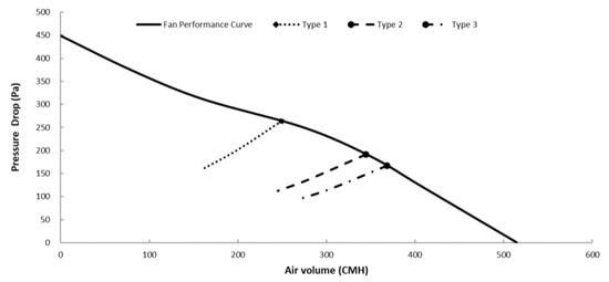 The lamp module operation points are 252 CMH/264 Pa, 348 CMH/192 Pa, and 376.3 CMH/167 Pa, for Types 1, 2, and 3, respectively. That is, the corresponding pressure drops are 264 Pa, 192 Pa, and 167 Pa. In other words, the Type 3 design performs best with both a smaller pressure loss (about 63% of the original standard design) and a larger volumetric flow rate (about 149.4% of the original standard design, as shown in Figure 10 and Table 3. Combined with the results shown in Figure 9, the non-uniform and highly skewed air flow of the original standard design (Type 1) due to the fan and flow resistance are not only mitigated by the proper design of the flow guides (Type 3), but also increased volumetric flow rates at both inlets and outlets while achieving a smaller pressure drop. Namely, the Type 3 design performs more efficiently while achieving a larger volumetric flow rate. Therefore, Type 3 was fabricated and tested. The tested results confirmed the design with a smaller pressure drop.