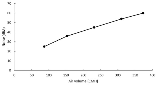 As the Type 3 design is more energy efficient, it was expected that its noise level should also be lower. Hence, the fabricated Type 3 design was tested in a semi-anechoic chamber for its noise level. The results obtained at the location 1 m from the lamp are drawn in Figure 11. The noise at the operation point (376.3 CMH/167 Pa) is about 58 dBA, which is about 8 dBA smaller than that of the Type 1 design, confirming the expectation. It can also be observed that the noise level increases as the flow rate increases, as expected. Hence, if the noise level is of great concern, it is possible to use multiple fans (i.e., multiple lamps) while running the fans at a smaller flow rate so that both the smaller noise level and the needed flow rate requirement can be accomplished simultaneously.