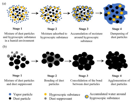 Schematic of dust suppression mechanisms: (a) hygroscopicity and (b) agglomeration.