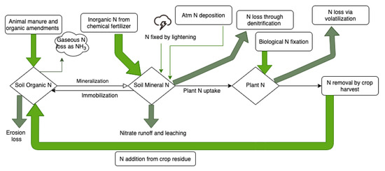 Over the last five decades, the global N cycle has changed significantly due to the incessant input of nitrogen fertilizers. Nitrogen cycling involves five major steps; biological N fixation, ammonification, nitrification, N assimilation into microbial biomass pool, and finally denitrification [5]. However, both chemical N fertilizers and organic manure are often applied to soil in exceeding amounts for crop growth requirements lead to N loss. Of the applied N for crop growth, only 45–50% is being incorporated into the agricultural products [6] and the remainder is subjected to substantial loss [7]. A significant amount of N in soil and may be lost to the environment as NO3, NH3, or N2O [8,9]. NO3 may also continue to undergo recycling in the soil–water–air system and convert to N2O and N2 through the denitrification process and released back to the atmosphere [10]. Particularly, N2O emission is substantial from production agriculture at the beginning stage of N fertilizer application during the cropping season [11]. Furthermore, the potential warming effect of N2O and the short-term cooling effect of NH3 and NOx both has major consequences on global human and environmental health [12,13]. Additional complications in estimating N2O arises from the nonlinear nature of N2O emission in response to N fertilizer application along with other soil and environmental controlling factors [14]. Intergovernmental Panel on Climate Change (IPCC) linear model, one of the approaches to estimating N loss in terms of N2O, which may overestimate N loss at lower N application rates while underestimating higher rates [15,16,17] (Figure 1).