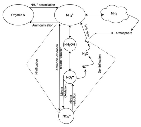 Nitrogen contains readily converted reactive chemical (reactive nitrogen; Nr) [24] species causing a cascading effect on the environment and impacting the global ecosystems [31]. These reactive species are N2O, NO3−, nitrite (NO2−), NH3, and ammonium (NH4+) and mostly of anthropogenic origins such as fossil fuel combustion and agriculture (both legume cultivation and use of industrial fertilizers) (Figure 2).