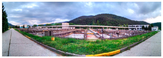 The noise source that we evaluated was the operation of the wastewater treatment plant and, in particular, the individual pieces of equipment located on the treatment plant site. The operation of the treatment plant is continuous and the nature of the sound emitted by the equipment is stable. The treatment plant purifies wastewater from a paper-manufacturing company’s industrial plant, along with wastewater from residents and other wastewater producers in the town and connected villages. A view of the treatment plant premises is given in Figure 1. The critical sources of noise on the site of the wastewater treatment plant are the: