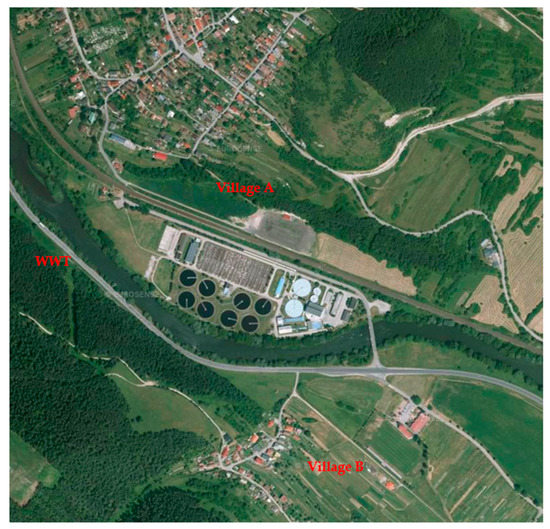 The wastewater treatment plant site is located between two villages. Village A is located at a distance of approximately 200 m north of the treatment plant site, while village B is at a distance of approximately 180 m south of the treatment plant site. The villages contain mainly houses for families. A view of the wastewater treatment plant area and the adjacent villages is shown in Figure 2.