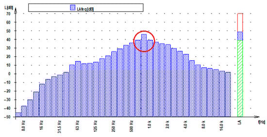 The measurement results of the equivalent noise levels are given in Table 1. It is clear from the frequency analysis of the noise measurement results that the noise is characterized by tonal components at a frequency of 800 Hz, as shown in Figure 3.