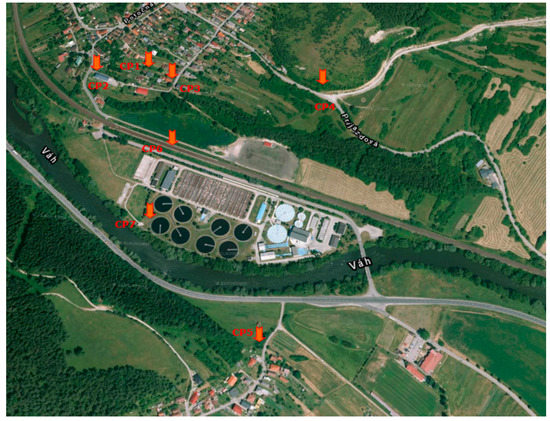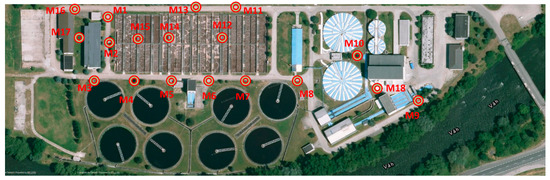 The locations of the measuring points on the site of the wastewater treatment plant.