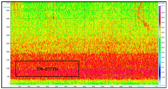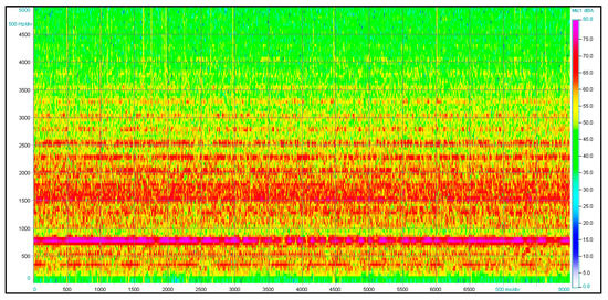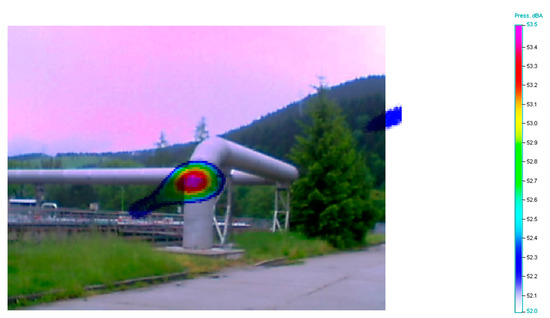 Measurement no. 1 was carried out with a focus on the pipes designed for air distribution from a distance of 20 m. Figure 5 shows a view of the installed acoustic camera. Figure 6 shows the noise emissions of the visualized object across the 740–840 Hz frequency band. The location of the integrated noise source is evident from the acoustic image presented. Figure 7 shows the noise spectrogram for this measurement. It is clear from the spectrogram that the dominant frequencies are in the range of 740–840 Hz.