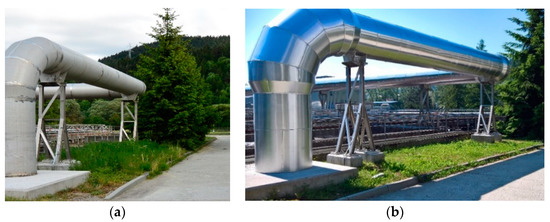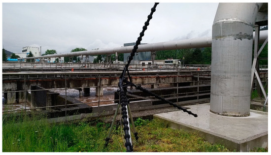 The air distribution line provides air supply to the activation tanks. The air is ducted from the blower room through a pipe with a 1200 mm diameter and a total length of 70 m under a pressure of 60–63 kPa and a flow rate of 62,000–64,000 m3/h. Herein, acoustic insulation of the pipe consisted of wrapping the full length of the air distribution pipe with mineral wool with a thickness of 120 mm and a density 60 kg.m−3, as well as application of a protective PE (polyethylene) film and an external stainless steel sheet with a thickness of 3 mm. A stainless steel sheet with a thickness of 3 mm was selected due its good weather resistance, good formability, and good price–performance ratio.