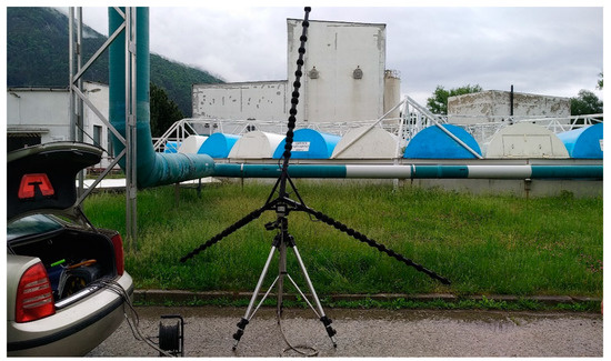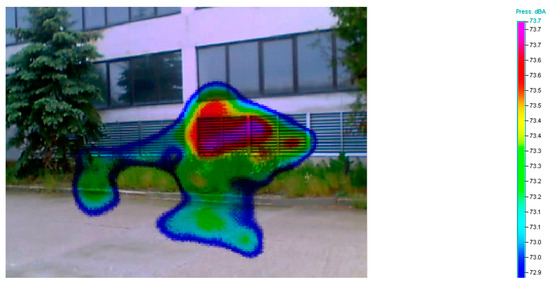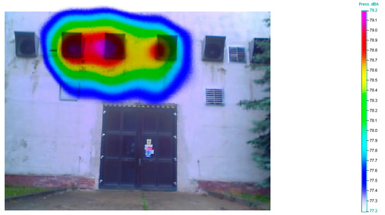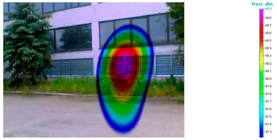 An acoustic camera is a measurement tool that joined the field of acoustics a few years ago. This technology analyzes the actual sound scene, which consists of a superposition of different sound sources, and then combines them into a visual sound map. The basic principle relies on the accurate calculation of the specific runtime delays of acoustic sound emissions radiating from several sources to the individual microphones of an array. An acoustic map of the local sound pressure distribution at a given distance is calculated using the acoustic data of all simultaneously recorded microphone channels. The sound pressure level is displayed via color coding, similar to popular thermal imaging. The application of an acoustic camera was also presented in [20]. Bocher et al. conducted noise modeling in their research, and they described an open source form for the implementation of a noise mapping tool that is fully implemented in a geographic information system compliant with the Open Geospatial Consortium standards. The contribution of these authors made easier the formatting and harvesting of noise model input data and output data, linkage with population data, and also cartographic rendering [20]. The use of noise mapping is very important and necessary to ensure environmental noise control, as well as industrial noise control. Noise maps are established to obtain information for noise reduction planning [6], and noise mapping presents the best suitable way to present information on acoustic pollution [21].