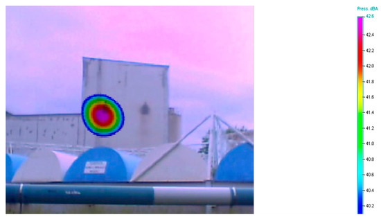 Measurement no. 4 was carried out with a focus on the object of the sludge farm from a distance of 43 m. Figure 15 shows a view of the acoustic camera installed. Figure 16 shows the noise emissions of the visualized object throughout the frequency band. The location of the integrated noise source is evident from the acoustic image presented. Figure 17 shows the noise spectrogram of this measurement.