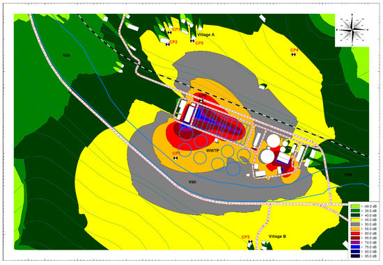 It was clear from the measurements that the permissible noise levels in these municipalities were being exceeded due to the wastewater treatment plant. Measurements directly at the wastewater treatment plant were carried out in order to identify the partial noise sources. For more accurate analysis, a unique tool for visualizing noise was used, namely, an acoustic camera. On the basis of these measurements, the dominant noise sources were identified on the wastewater treatment plant site. Subsequently, a proposal was made to reduce the noise of the dominant noise sources, and mathematical models were created for a preliminary assessment of the efficiency—i.e., noise maps of the current state and a predictive noise map simulated with the measures. On the basis of these noise maps, it was predicted that the above proposals would contribute to reducing noise in the surrounding villages.