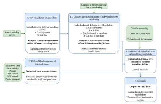 Method employed in the quantification of the greenhouse gases (GHG) emissions of car sharing at an individual and city level. Blue boxes are modelling steps and green boxes are data inputs.