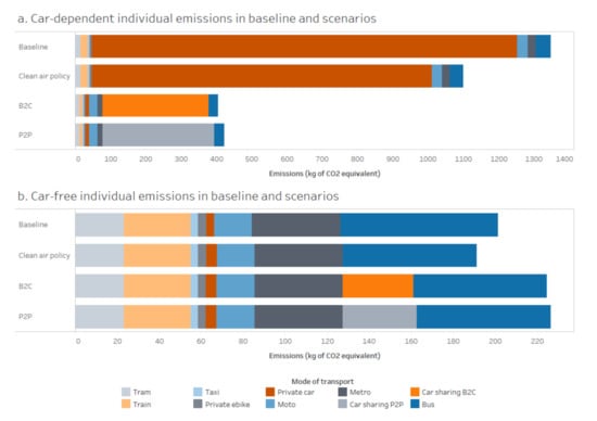Annual GHG emissions of individuals with car-dependent (a) and car-free (b) travel habits () (Equation (8) differentiating between modal share () (Equation (5)). Emissions include four different scenarios: Baseline, Clean Air Action Plan, B2C car sharing, and P2P car sharing. P2P—Peer-2-peer. B2C- Business-to-consumer. Note the difference between the x-axis scales on the graphs.