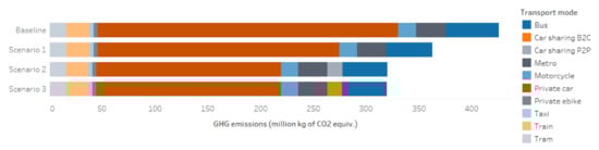 Total transport emissions in each of the scenarios () (Equation (11)). All scenarios include the implementation of the Clean Air Action Plan, while scenario 2 and scenario 3 include changes in travel behaviour due to B2C and P2P car sharing. B2B—Business-to-consumer and P2P—Peer-to-peer.