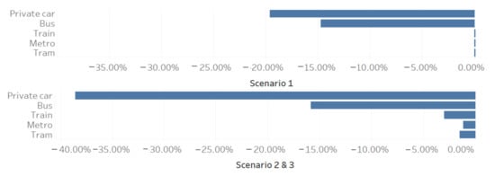Private vehicles accounted for most of the emissions in all scenarios, followed by bus, metro, and train (Figure 3). These transport modes account for most of the passenger-km travelled in all scenarios (Table 5). Although they emitted the most in all scenarios, they also presented the highest reductions in emissions in each scenario compared to the baseline (Figure 4). The annual emissions of private cars decreased in approximately by 20% in scenario 1 and by 38.6% in scenarios 2 and 3.