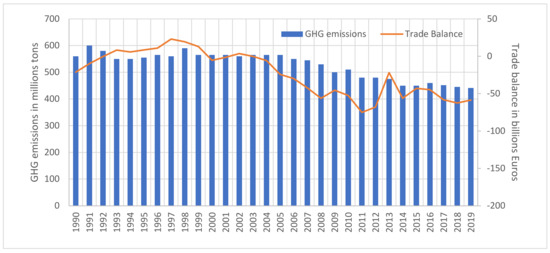 This sharp reduction should be put into perspective. Indeed, the inventory of national GHG emissions takes into account emissions linked to national production but not to imports; therefore, industrial offshoring led to a drop in national emissions [9,10]. Figure 2 puts into perspective the GHG emissions over 25 years (French Ministry of the Environment) and the evolution of the French trade balance.