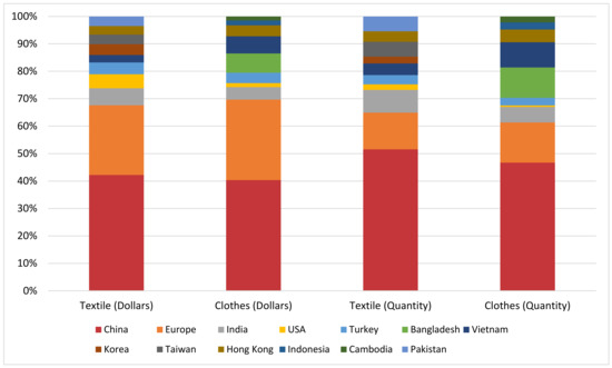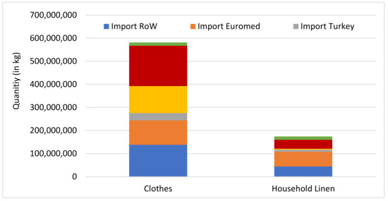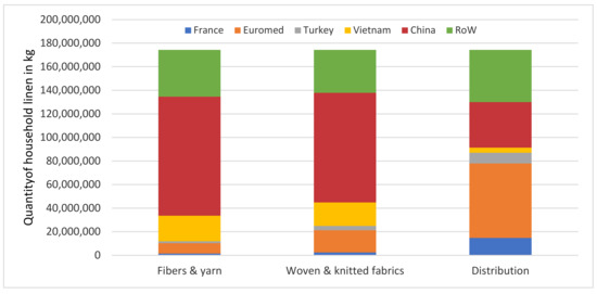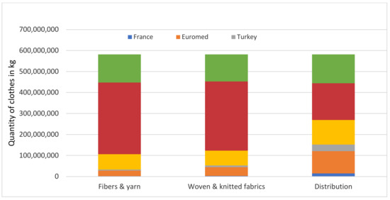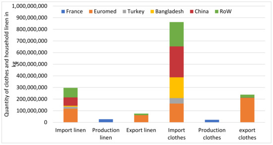 One of the difficulties of the study is the estimation of the quantities of textiles transformed in each country from the first stages of textile production until they reach the consumer market in France [21]. In this context, two data sources are necessary beyond the data produced by Refashion. One part of the data concerns the French trades (importation and exportation) of the textile products; those originate from the customs administration. Additionally, another part of the data is those related to French production which is accessible in the European Prodcom database [22]. This information is compiled annually by two French organizations: the IFM (Institut Français de la Mode) and the UIT (Union des Industries Textiles) [21,22]. The data produced by these organizations is commonly presented in value or quantity, and includes all imports and exports supplying (or supplied by) the French market. Figure 5 presents the quantities and aggregates the countries according to the main market shared used by French manufacturers. Thus, beyond the French production, the selected import/export zones include Euromed zone (which includes the European countries plus Tunisia and Morocco), Turkey, Bangladesh, China, and the other countries that are gathered under “RoW” (Rest of the World) category. The data presented below are adapted from the main data sources [22,23,24,25].