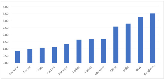 Productivity data presented in Figure 8 are extrapolated from two studies of the textile sector. In this case, one part is related to a comparative study of production costs for the textile sector produced by the UIT [23] and the other part is based on labor costs by country [27,28]. Productivity values allow the conversions of the exported value of textile, clothes and household linen (Figure 9, left part) to exported quantities (Figure 9, right part).
