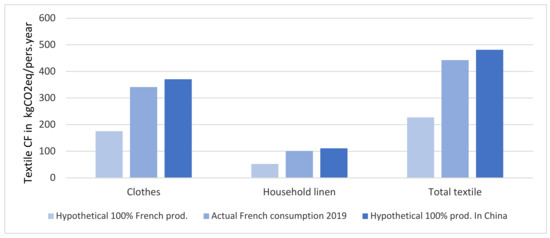 The CF originating from the textile product purchased by a French citizen in 2019 is 442 kg of CO2eq. According to the Ministry of the Environment, a citizen’s CF is 11,205 kg per year (in 2018). Thus, it is possible to estimate that the share of textile purchases in the CF is 3.9%. Full production of the sector to a country with a low carbon electricity mix such as France would reduce this footprint by half.