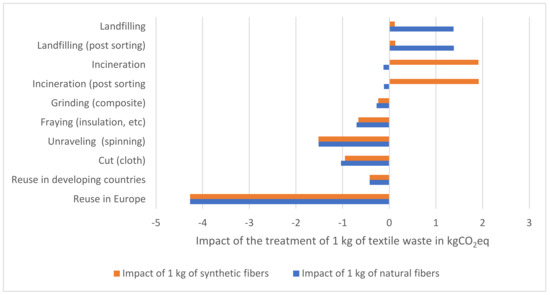 The results of this study allow comparing different aspects of textile waste treatment routes and processes at the end-life of textile products in France in 2018 (38% treated in the revalorization process, 28% in incineration with recovered energy and 34% in landfills) [11]. The recovery sector is dominated by reuse (58.6%), then recycling (32.4%) but also includes a part of incineration (8.4%) and landfill (0.6%). The calculation of the carbon emissions of this sector per one kg of treated fibers indicates a low environmental impact of textile end-of-life (0.2% of the total impact of one kg of textile) and allows to distinguish the impact of the end-of-life of natural fibers (49 g of CO2eq/kg of end-of-life fibers) from artificial fibers (249 g of CO2/kg of end-of-life fibers) [11,21].
