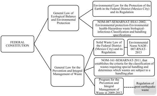 In Mexico, the General Law of Ecological Equilibrium and Environmental Protection (LGEEPA, acronym in Spanish) establishes the framework of concurrent competencies of the three levels of government [53]. Each level has the power to develop, conduct and apply environmental policy, as well as to protect the environment and preserve and restore ecological balance within their jurisdiction [54]. Municipal solid waste and special waste management is the responsibility of municipal officials and the officials of Mexico City, while hazardous waste management is managed at a federal level. In 2003, the General Law for the Prevention and Integral Waste Management (LGPGIR, acronym in Spanish) was issued as part of the Federal Constitution of Mexico to promote sustainable development, by preventing the generation, and promoting the recovery and integral management of waste, as well as preventing soil contamination [55] (Figure 2). However, neither this law nor the associated regulations expressly regulate earthquake waste, which includes all waste categories.
