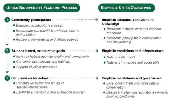 Urban biodiverse planning processes can be used to help meet the goals of other related ecosystem services priorities, including designing for biophilic cities. Urban biodiversity planning processes include goal setting, community participation, and setting of priority actions. We argue that identifying science-based goals for urban biodiversity, using community participation to guide and inform the planning process, and allowing priority actions to flow from goals and community input are all useful in meeting the objectives and tenets of biophilic cities. The biophilic cities movement has ambitious objectives that can often benefit from the specific science-based targets that urban biodiversity planning can provide. Community engagement processes that form the foundation for biodiversity planning can also be used to build biophilic attitudes, behaviors, and knowledge in local community members, particularly when engagement persists after the planning process is complete. The setting of priority actions also often includes identification of financing mechanisms, policies, and regulations that can be used to implement urban biodiversity goals, and these policies and programs are also at the core of building biophilic institutions and governance.
