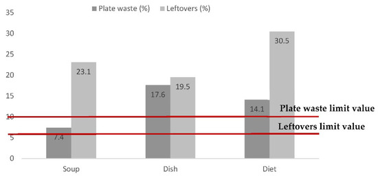 Soup leftovers ranged between 12.2% and 27.8%, with an average value of 23.1%, and plate waste ranged between 4.7% and 9.3%, with an average value of 7.4% (Table 1).