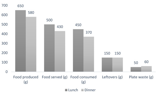Comparison between food produced, served, consumed, plate waste and leftovers by meal (n = 2987) [25].