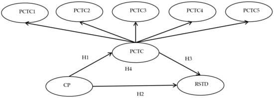 To test the hypotheses, SEM was conducted using the on-site collected data. Path coefficients of different dimensions were significant, revealing the significant meaning of endogenous constructs in the model structure of this study in terms of statistics [63]. The significance of path coefficients was tested using bootstrap sampling. All path coefficients were significant, indicating all variables had predicted power. Table 4 describes the results of the hypothesis test. The hypothesized negative relationship between CP and PCTC (H1) was supported (β = −0.22, t = −2.638, p < 0.01). H2, which hypothesized a positive relationship between CP and RSTD, was also supported (β = 0.66, t = 8.082, p < 0.001). As predicted by H3, PCTC negatively affected RSTD (β = −0.15, t = −2.429, p < 0.01), providing support for H3.