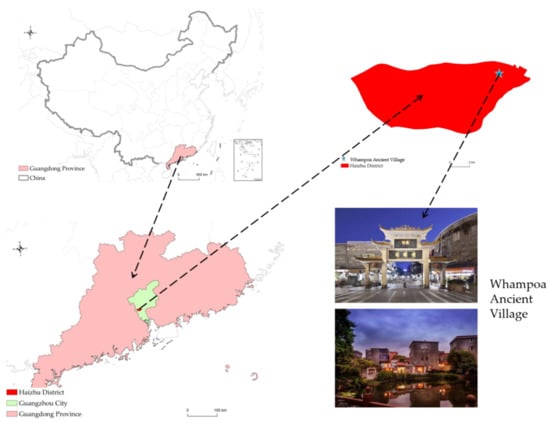 Whampoa Ancient Village (WAV) is located in the east of Haizhu District, Guangzhou, Guangdong Province, China, close to the Pearl River (see Figure 2). It is one of the originating ports of the China Maritime Silk Road and plays an important role in the history of China’s shipping.