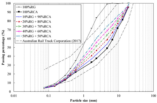 RG and RCA were sourced from a recycling facility in Australia. Both recycled materials were processed with standard pulverization technics to create well-graded aggregates following the local guidelines and standards [21]. Figure 1 presents the particle size distribution of both materials. RG had the maximum particle size of 5 mm, while that of RCA was at 20 mm. RG and RCA were classified as well-graded gravel and well-graded sand, respectively [22]. RCA was produced to meet the maximum requirements of undesirable and foreign materials specified in [21]. RCA had less than 2% high-density materials including brick and ceramic, less than 0.5% low-density materials such as plastic, paper and rubber, and less than 0.1% wood or other vegetables. RG was also produced from recycling kerbside collection of bottles and glass containers with less than 2% contaminants such as paper, corks, metals, and other harmful materials specified in [21]. RCA had a specific gravity of 2.7, whereas the specific gravity of RG was measured to be 2.47. Water absorption of RCA was measured to be approximately 9%, while that of RG was recorded to be less than 1% following the procedure outlined in [23,24]. RCA experienced a Los Angeles Abrasion loss of 31 using grading B outlined in [25]. This value was lower than the maximum limit set by Li et al. [10] for subballast materials.