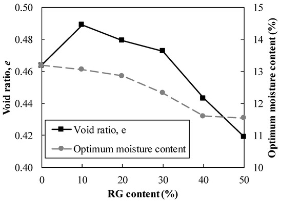 Compaction tests were conducted to determine the maximum dry density (MDD) and optimum moisture content (OMC) of blends using standard Proctor energy [26]. The compaction parameters of blends are presented in Table 1. The OMC of blends reduced with the increase in RG content as shown in Figure 2. Nonetheless, between 40% and 50% RG content, the OMC did not change significantly. MDD values also showed a decreasing trend until 30% RG content, after which the MDD increased substantially with 40% and 50% RG percentages. The shift of PSD curves of blends in the coarse section toward the finer values facilitated the densification of aggregates for the case of 40% and 50% RG contents. This behavior is shown in Figure 2, which presents the plots of void ratio, e, at MDD of blends with RG content. Void ratio of both blends with 40% and 50% RG content was calculated to be less than the parent aggregates.