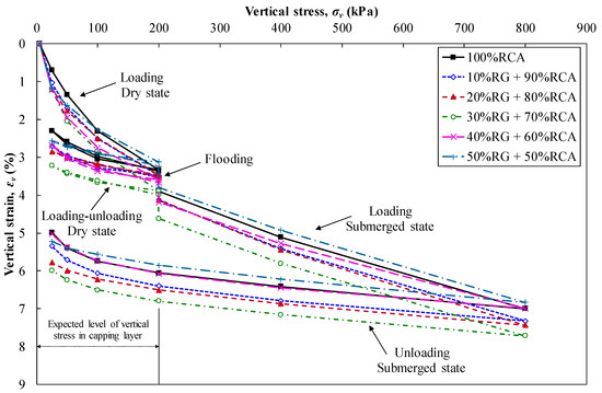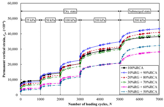 1D compression responses of recycled blends under static and cyclic loading are shown in Figure 3 and Figure 4. 1D static compression results in Figure 3 consisted of five distinguished sections, namely loading, unloading–reloading in the dry state, flooding, and loading–unloading in the submerged state. The materials showed a nonlinear response upon loading with decreasing the non-linearity upon unloading. Inclusion of RG changed the recorded values of vertical strain among different samples, while the trend of stress–strain response of all blends was almost similar. Moreover, Figure 4 illustrates the variation of permanent vertical strain, ɛpv, with the number of loading cycles under 1D cyclic compression loading. Total vertical strain response of granular materials under one-way haversine cyclic loading consisted of a resilient portion and a permanent response [32], the latter of which is presented in Figure 4. Based on Figure 4, all samples experienced an initial rise in their ɛpv with the increase in the applied . After approximately 500 cycles, the rate of ɛpv accumulation reduced in all stages, and ɛpv values were increasing almost linearly with the number of loading cycles. With the addition of water, the ɛpv experienced another rise due to the facilitation of particles’ rearrangements and reduction of matric suction [40]. In both 1D compression tests, RG content did not have a clear trend of change on samples’ responses. However, RG + RCA blends with 40% and 50% RG content generally showed a lower level of deformations under the k0-loading condition. This was due to the better packing density (i.e., void ratio) of 40% RG + 60% RCA and 50% RG + 50% RCA compared to the other blends (Figure 2).