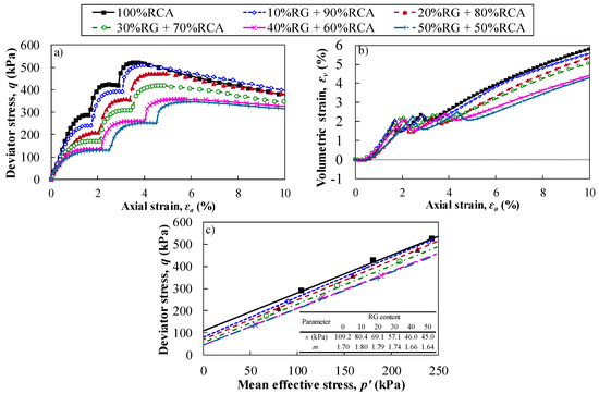 The effect of RG on shear strength and stress–strain responses’ RG + RCA blends is shown in Figure 5. The strain-softening behavior associated with the reduction of deviator stress after reaching the peak deviator stress, qpeak, can be observed in Figure 5a. Addition of RG had a noticeable effect on the stress–strain behavior of RCA. The qpeak of recycled blends decreased at all three confining pressures with increasing the RG content. This was due to the lower shear strength of RG particles compared to that of RCA. However, the axial strain corresponding to the qpeak increased at each confinement with the increase in RG percentage. This was related to the low level of strain-softening of RG at low to high confining pressures [41]. Therefore, the increase in RG content reduced the brittle response of RCA toward more ductility due to the increase in RG particles interaction in the samples’ force chain skeleton. Volumetric strain responses in Figure 5b indicate minimal compression of recycled blends at the first confinement of 10 kPa with the limited effect of RG content on the results. However, dilation of blends decreased noticeably with increasing the RG percentage due to lower dilation of RG compared with that of RCA.